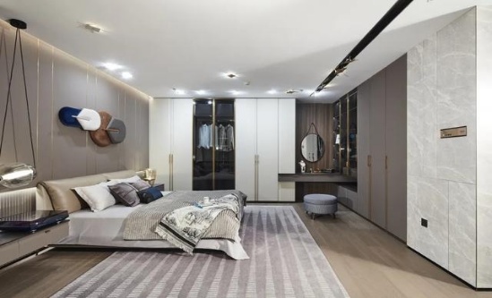 臥室的衣柜設計采用梳妝臺與衣柜的一體化設計,L型的超大衣柜提供了充足的收納空間,轉角處的梳妝臺巧妙利用空間,還增強了整體的實用性,更加符合當代女性的臥室功能需求,兩全其美。