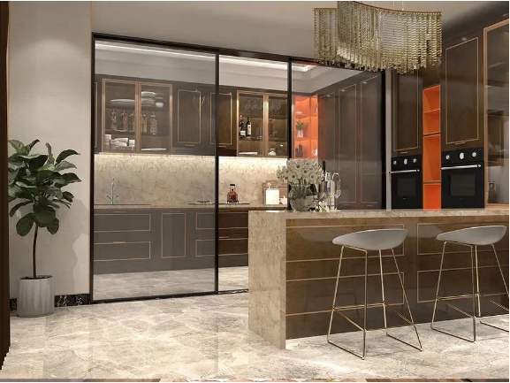 假如擔(dān)心油煙侵襲,只需裝上玻璃趟門,餐廚空間隔而不斷,區(qū)隔開(kāi)了空間又保持了交流感。