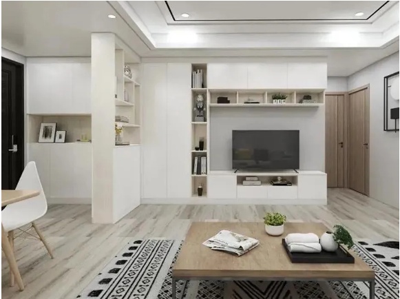 而假如入戶是和客廳相鄰的情況,可以設(shè)計(jì)一個(gè)收納功能和展示功能并存的入戶鞋柜區(qū)隔開(kāi)兩個(gè)空間。