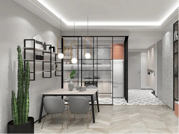 家里戶型入戶和餐廳空間相鄰,可以選擇用玻璃隔斷或入戶鞋柜來(lái)實(shí)現(xiàn)隔斷效果。