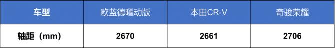 從上圖的軸距指標(biāo)我們不難看出,在三款車型中,奇駿榮耀的軸距最長達(dá)到了2706mm,歐藍(lán)德曜動版和CR-V略微遜色但都超過了2660mm,相比之下前者稍占一點優(yōu)勢。不過,從實用性的角度來說,歐藍(lán)德還有7座版車型可選,對于二胎家庭來說這一點或許會更有吸引力。