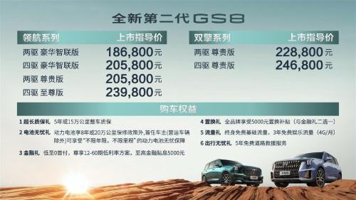 2021年12月12日,備受關注的全新第二代GS8正式上市。新車共推出6款車型,領航系列4款,雙擎系列2款,官方指導價為18.68萬元-24.68萬元。同時,官方還推出了超長質保禮、電池無憂禮、金融禮、置換禮、流量禮、出行無憂禮等購車政策。