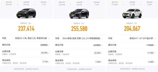 那么再具體點(diǎn),我們簡(jiǎn)單來(lái)計(jì)算一下落地價(jià)。先看本田CR-V銳·混動(dòng)2.0L兩驅(qū)凈行版,官方售價(jià)為20.98萬(wàn)元,必要花費(fèi)約為20496元,全險(xiǎn)7118元,落地需237414元;豐田榮放雙擎2.5L兩驅(qū)精英版,官方指導(dǎo)價(jià)為22.58萬(wàn)元,必要花費(fèi)約為22332元,全險(xiǎn)為7456元,落地總計(jì)需要255588元。