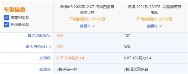 再看攬境,雖搭載的同為2.0T渦輪增壓發(fā)動(dòng)機(jī),但是表現(xiàn)力就差很多,攬境的最大功率僅為137kW,而峰值扭矩是320N·m,與哈弗H9-2022款相比,它也僅能達(dá)到186馬力,可謂差距甚遠(yuǎn)。