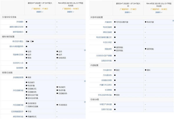 在選車時(shí),阿偉第一時(shí)間就打開(kāi)了各大汽車平臺(tái),一邊是自己喜歡的拿鐵DHT,另一邊是表哥推薦的豐田榮放,如上圖所示,同價(jià)位下拿鐵DHT優(yōu)勢(shì)非常強(qiáng)。但是表哥不死心,說(shuō)動(dòng)力肯定是日系車占優(yōu)勢(shì)。