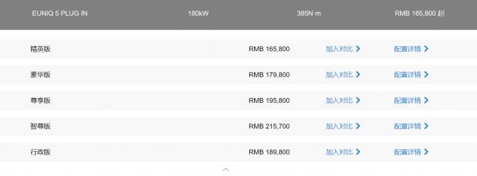 上汽大通MAXUS EUNIQ 5 PLUG IN有精英版、豪華版、尊享版、智尊版、行政版這5個(gè)版本,價(jià)格對(duì)應(yīng)在16.58萬~21.57萬之間。整體從基礎(chǔ)款到高配款,價(jià)格都比較合理而且很具性價(jià)比。