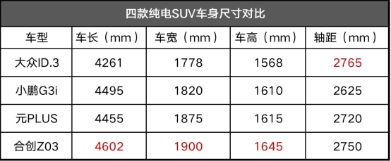大空間和長(zhǎng)續(xù)航一樣,都是購(gòu)車剛需條件。特別是家庭用戶,空間大小決定舒適程度,關(guān)系著一家人出行的幸福感。四款純電SUV車型由于均出自純電平臺(tái),ID.3的軸距最長(zhǎng),但僅僅比合創(chuàng)Z03長(zhǎng)15mm,Z03的長(zhǎng)寬高卻遙遙領(lǐng)先。