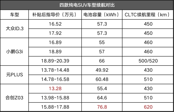 小鵬G3i并不是主打續(xù)航的車型,起售價(jià)格最高,但續(xù)航僅為460km,市內(nèi)通勤的水平,要500km的續(xù)航就請(qǐng)準(zhǔn)備超過20萬的落地費(fèi)用;2022款大眾ID.3的續(xù)航選擇只有450km一種,也是市內(nèi)通勤車的水準(zhǔn);元PLUS可以提供430km和510km的續(xù)航里程,結(jié)合售價(jià)來看,性價(jià)比相對(duì)合理;2022款合創(chuàng)Z03提供三種續(xù)航選擇,其中430km只需要13萬出頭,14萬不到就能買到510km續(xù)航,16萬不到就能選擇有620km續(xù)航的車型,620km足夠支持單程250公里的城際間來回一趟,讓用戶的用車場(chǎng)景更加豐富。