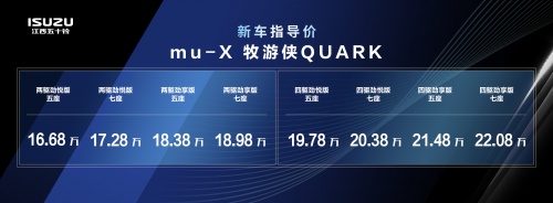 年輕人期待已久的越野潮品類燃擎來襲!5月10日,“科考級SUV”mu-X牧游俠QUARK汽油版上市,共推出8款車型,官方指導(dǎo)價(jià)16.68萬—22.08萬元。