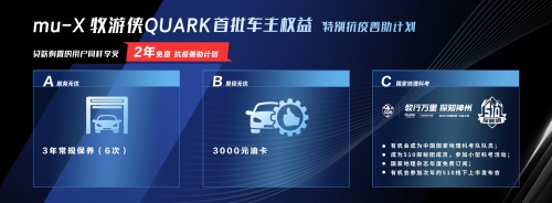mu-X牧游俠QUARK不僅以汽油車身份出道,更帶來誠意十足的2年免息和抗疫善助計(jì)劃(即日起至6月30日),包含服務(wù)無憂禮(3年6次免費(fèi)保養(yǎng))、里程無憂禮(3000元油卡)、國家地理科考禮。以虔誠之態(tài),mu-X牧游俠QUARK讓城市野望者從容出走,讓游走世界者信步城市。