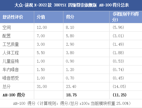 在靜態(tài)得分部分,途觀X的整車(chē)工藝還是不錯(cuò)的,全新的內(nèi)飾也沒(méi)有什么安裝工藝的問(wèn)題。此外這次測(cè)試的是頂配車(chē)型,所以配置也是非常全面,在得分上自然也是高出同級(jí)別平均得分不少。