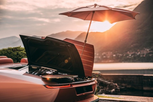 “浮影”的車(chē)尾甲板采用蝶式設(shè)計(jì),內(nèi)里精巧絕倫的“待客套件”包裹在皇家胡桃木飾面之中,其嵌以玫瑰金細(xì)條,與緞光飾面相呼應(yīng),外觀細(xì)膩而精妙。其所采用的皇家胡桃木由客戶臻選,隨著時(shí)間推移更具質(zhì)感,并逐漸向干邑色過(guò)渡。從上方向下看,冷峻的引擎蓋與觸感細(xì)膩的木質(zhì)車(chē)尾甲板實(shí)現(xiàn)和諧且仿若緞面的視覺(jué)效果,與車(chē)身正面與側(cè)面的高光澤度形成鮮明對(duì)比。