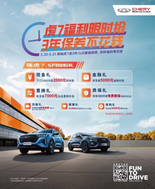 2002年5月20日-5月31日,奇瑞瑞虎7系列推出優(yōu)惠活動(dòng),買就送3年6次基礎(chǔ)保養(yǎng)!5月回饋禮包括:一、現(xiàn)金補(bǔ)貼(訂金1000抵2000);二、金融補(bǔ)貼;三、以舊換新優(yōu)惠;四、質(zhì)保延長;五、送流量;六、空調(diào)濾芯贈(zèng)送;七、增購補(bǔ)貼。一起來看看吧!