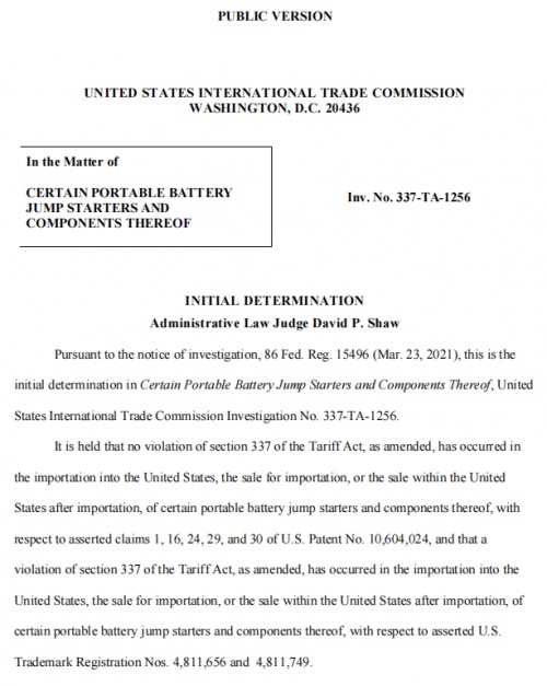 上圖為本次判決書的首頁內(nèi)容,相當(dāng)于是國內(nèi)發(fā)布文件的抬頭,告知閱讀者簡要信息以及權(quán)威性。大概內(nèi)容是:ITC行政法法官David P.Shaw對第337-TA-1256號調(diào)查案的初步裁定:本案認(rèn)為,進(jìn)口到美國、為進(jìn)口而銷售或進(jìn)口后在美國境內(nèi)銷售某些便攜式啟動電源及其組件,對美國專利號10,604,024的權(quán)利要求1,16,24,29和30部分沒有違反經(jīng)修訂的《關(guān)稅法》第337條的規(guī)定,以及美國商標(biāo)注冊號4,811,656和4,811,749,進(jìn)口到美國、為進(jìn)口而銷售或進(jìn)口后在美國境內(nèi)銷售某些便攜式電池起跳器及其組件,違反了經(jīng)修訂的《關(guān)稅法》第337條。
