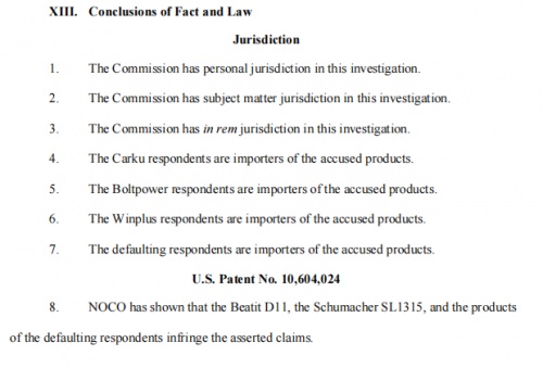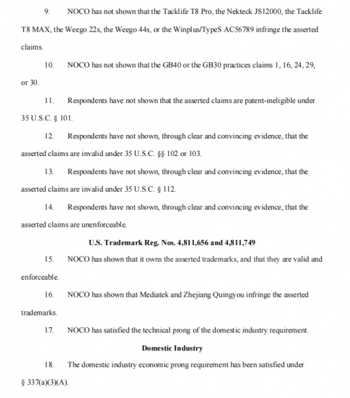 1、第9條,表明了以carku為代表的企業(yè)(Tacklife 、Weego等產(chǎn)品的制造商都是carku)產(chǎn)品沒有侵權(quán);第10條表明,NOCO產(chǎn)品不滿足024專利,這點(diǎn)標(biāo)示著中國企業(yè)的應(yīng)急啟動電源產(chǎn)品在ITC不再受到影響,在ITC解放了整個行業(yè)。