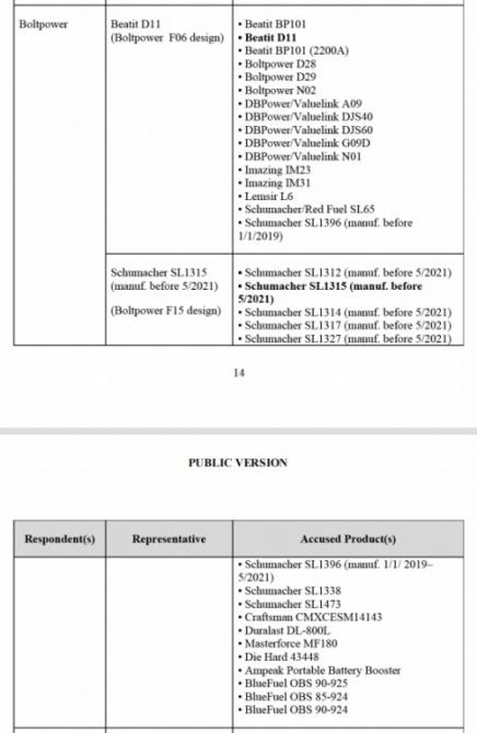 根據(jù)33頁(頁碼14)內(nèi)容可以看出,Beatit D11、Schumacher SL1315的制造商都是Boltpower電將軍,這正是一家中國企業(yè),且Beatit D11、Schumacher SL1315這兩款產(chǎn)品在本次337訴訟中各自代表著Boltpower生產(chǎn)的一系列產(chǎn)品(各16款共32款),因此,以后可能會面臨NOCO在美國其他維權(quán)機(jī)構(gòu)的索賠,如在法院及亞馬遜等。