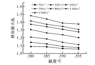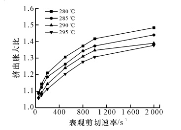 | 圖3:不同溫度下表觀剪切速率-基礎膨大比關系 | 圖4:不同剪切速率下溫度-擠出脹大比關系 |