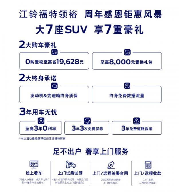 為回饋廣大用戶一路以來的支持與厚愛,在江鈴福特領(lǐng)裕(簡(jiǎn)稱“領(lǐng)裕”)上市一周年之際,江鈴福特科技特別推出領(lǐng)?!爸苣旮卸麾牷蒿L(fēng)暴”。即日起至7月31日,領(lǐng)裕全系購車用戶,均可享受“2大購車豪禮”“2大終身承諾”“3年用車無憂”七重豪禮,尊享“免費(fèi)升艙”般超值體驗(yàn)。官方讓利,價(jià)值升級(jí),江鈴福特科技再次夯實(shí)領(lǐng)裕大7座SUV性價(jià)比標(biāo)桿地位,以十足誠意,陪伴用戶攜其所愛,共赴山海。