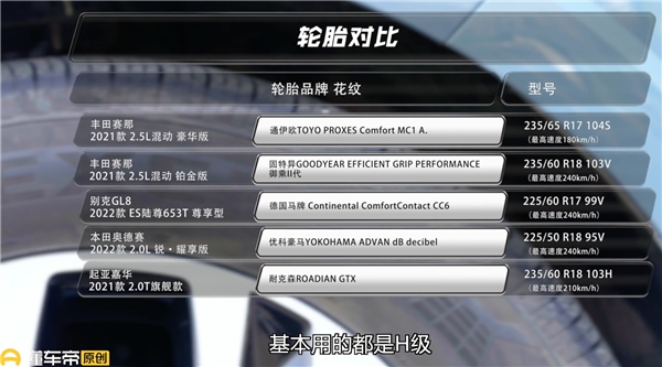 據(jù)節(jié)目介紹,出現(xiàn)如此大差異的原因可能是因?yàn)閹卓钴嚺鋫涞妮喬ゲ煌饋喖稳A配備了H級(jí)輪胎,允許的最高行駛速度為210km/h,而別克GL8、本田奧德賽和豐田賽那高配使用的都是V級(jí)胎,只有豐田賽那低配版使用了S級(jí)輪胎,允許的最高速度為180km/h。