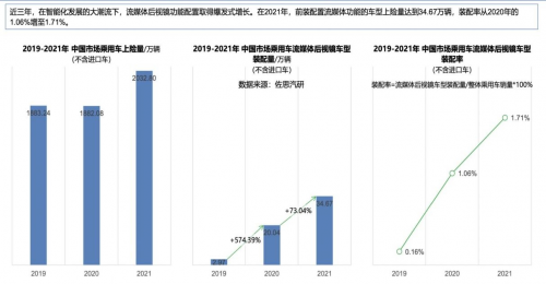 順帶說一句,看起來高大上的電子后視鏡算是個(gè)很新的智能化零部件,在2017年之前只有BBA等豪車的部分車型才裝配,市場長期被美國公司壟斷,價(jià)格自然不便宜。隨著遠(yuǎn)峰科技等國產(chǎn)替代產(chǎn)品的崛起,才快速走入尋常百姓家,逐漸成為主流中高端車型的標(biāo)配,根據(jù)佐思汽研數(shù)據(jù)顯示,2021年國內(nèi)裝配流媒體后視鏡的車型上險(xiǎn)量已達(dá)34.67萬輛。