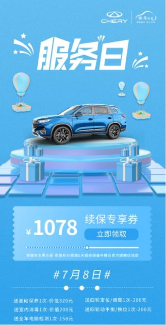 2022年7月8日當天,奇瑞用戶可通過“天貓奇瑞備件精品官方旗艦店”或“奇瑞車主俱樂部”微信公眾號/小程序,在“我的福利-積分商城”中參與0.1元/1積分搶“1078元續(xù)保專享券”。友情提示,每個平臺限量4000張,手快有,手慢無!