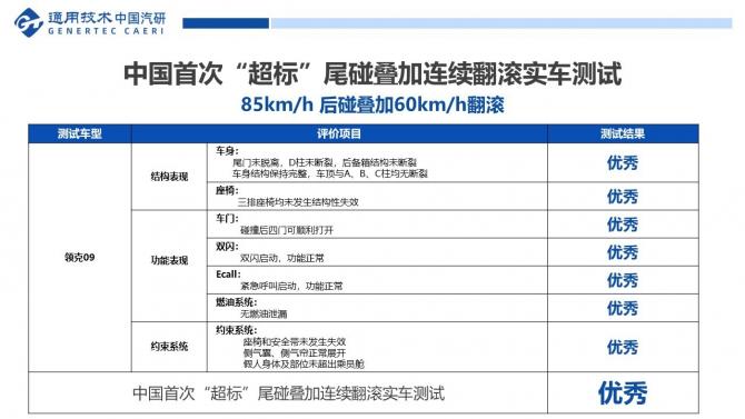 7月10日,領克09成功完成中國首次“超標”尾碰疊加連續(xù)翻滾實車測試。測試在重慶通用技術中國汽研官方試驗場進行,這也是通用技術中國汽研基于此標準的001號測試。此次測試,領克09在同一臺車上,先經過85km/h、70%重疊率追尾測試,后疊加 60km/h連續(xù)翻滾測試。最終,領克09滿足所有評價標準,取得全優(yōu)成績,并獲得"追尾后翻滾性能A級"001號認證。