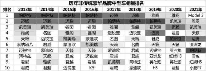 如果羅列一下最近 10 年中型轎車市場的銷量前十,你會發(fā)現(xiàn)排名靠前的車型非常固定。 帕薩特、邁騰、凱美瑞、雅閣,“兩田一眾”的這四臺車,幾乎對這個市場產(chǎn)生封鎖式 的霸榜狀態(tài)。 在新能源汽車引領(lǐng)的大潮下,這個世外桃源一般的合資家轎市場,終于被一臺 Model 3 沖破了——這是近 10 年來第一次出現(xiàn)非“兩田一眾”的銷量冠軍。