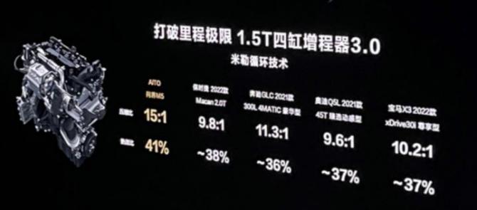 據(jù)悉,賽力斯開發(fā)的專為增程系統(tǒng)打造的第三代增程器,也就是1.5T四缸增程器,從功能來看這個發(fā)動機(jī)專注發(fā)電,采用深度米勒循環(huán)技術(shù),最高壓縮比達(dá)到15:1,擁有41%的超高熱效率。隨著中國發(fā)動機(jī)整體水平向世界看齊,這個熱效率水平比行業(yè)平均40%以下,有了很大的進(jìn)步。配合先進(jìn)的發(fā)電系統(tǒng),最大發(fā)電效率更是達(dá)到了3.2kW·h/L,把先進(jìn)發(fā)動機(jī)的機(jī)械能高效的轉(zhuǎn)化成電能,有效把能耗做下來,在高油價下省錢的效果是杠杠的。