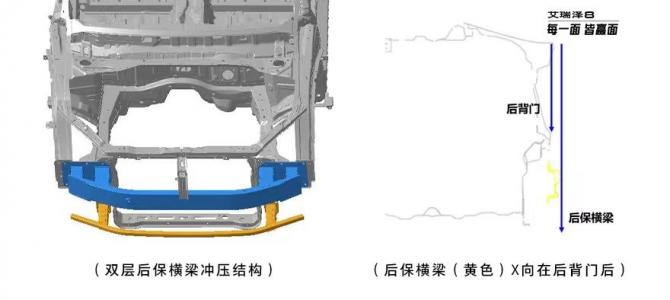在設(shè)計(jì)上,艾瑞澤8采用凸出的后保橫梁,擴(kuò)大緩沖空間,同時(shí),后保橫梁應(yīng)用雙層高強(qiáng)鋼沖壓結(jié)構(gòu)組成封閉截面,保證在發(fā)生碰撞中,后保橫梁能夠更好地吸收碰撞能量,保護(hù)后背門等貴重外觀件,不僅有效保障車內(nèi)乘員的出行安全,也降低了用戶在日常使用中的維修保養(yǎng)費(fèi)用。