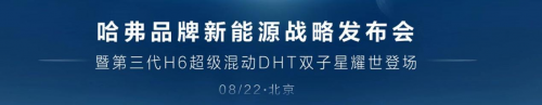 2022年8月22日,哈弗品牌新能源戰(zhàn)略發(fā)布會暨第三代哈弗H6超級混動DHT雙子星耀世登場活動將在北京水立方盛大舉行。作為引領(lǐng)中國SUV十余年輝煌的絕對王者,哈弗品牌將以厚積薄發(fā)之姿,王者之勢,一舉改變新能源汽車市場格局。