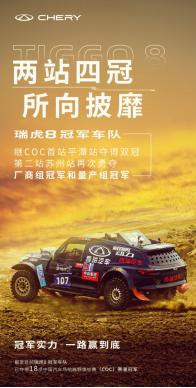 作為奇瑞汽車旗艦SUV系列,瑞虎8冠軍家族超越同級的冠軍實力使其深受全球超50萬用戶的信賴與熱愛。自2018年上市以來,瑞虎8冠軍家族不斷發(fā)展壯大,產(chǎn)品力不斷進階,在環(huán)塔(國際)拉力賽、中國量產(chǎn)車性能大賽CCPC、中國汽車場地越野錦標賽等多個頂級賽事中斬獲數(shù)十項冠軍,以冠軍佳績印證了冠軍家族實力。征程不斷,無懼挑戰(zhàn),未來,瑞虎8冠軍家族還將在技術(shù)與口碑方面持續(xù)發(fā)力,不斷續(xù)寫冠軍傳奇。