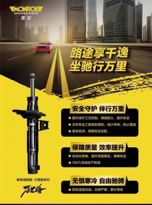 全新蒙諾萬里路系列Monro-Matic Plus?(簡稱MMP)減振器,是由全球工程師團隊合作研發(fā),每一款產(chǎn)品的研發(fā)均經(jīng)過苛刻的性能、強度、壽命測試和實車道路測試,確保產(chǎn)品的可靠性能,使車主享受舒適的駕乘體驗。