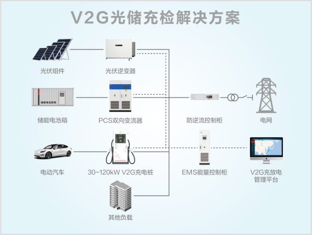 該方案基于科華自研自產(chǎn)V2G模塊、光伏、儲能、充電樁、云平臺等產(chǎn)品,將光伏、儲能、充電、放電、檢測等要素深度融合,具備以下功能特點(diǎn):