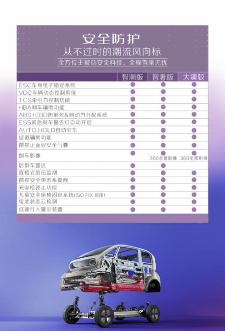 安全防護上,2023款KiWi EV全系標(biāo)配ESC車身電子穩(wěn)定系統(tǒng)、ABS+EBD防抱死&制動力分配系統(tǒng)、ESS緊急剎車警告燈自動開啟、AUTO HOLD自動駐車、直接式胎壓監(jiān)測、低速行人警示裝置等智能安全科技。智潮版配備倒車影像功能,智奢版及大疆版更配備360°全景影像功能,保障用戶出行的安全性和便捷性。此外,大疆版還配置有前駐車雷達,進一步拓寬了行車視野,保證駕駛安全性。