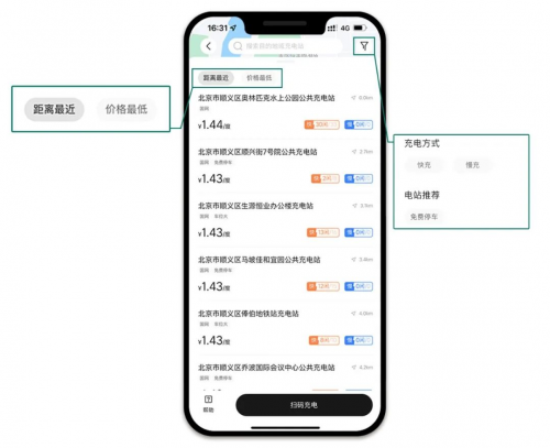 除了“距離最近”和“價(jià)格最低”,在界面右上方的菜單里還提供了快充、慢充以及是否免費(fèi)停車的選項(xiàng),可進(jìn)一步對充電樁進(jìn)行篩選。