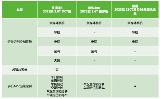 從上圖中可以感受到,艾瑞澤8誠意滿滿,智能語音識別系統(tǒng)+手機(jī)APP遠(yuǎn)程控制的功能非常全面,用戶動動嘴、點(diǎn)點(diǎn)手機(jī)幾乎就可以完成大多數(shù)車內(nèi)功能,這就是科技所帶來的便捷享受。反觀標(biāo)致408和大眾朗逸,雖然也配備了智能語音識別和手機(jī)APP遠(yuǎn)程控制功能,但實用性和豐富性略遜。
