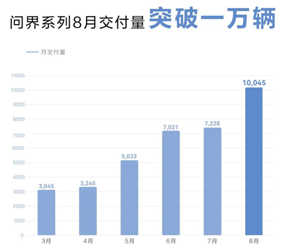 問界系列家族上市后深受消費者喜愛,170天就完成超3萬臺交付。8月份,克服了缺芯、疫情、高溫、限電等因素影響,問界系列車型的交付量達到了10,045輛,創(chuàng)造了國內(nèi)新能源汽車品牌單月交付破萬最快的紀(jì)錄。問界M5 EV在上市后不到四小時,訂單數(shù)已經(jīng)突破30000。