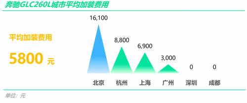 作為平均加裝費(fèi)用達(dá)5,800元的“榜首”車型,奔馳GLC260L的加裝費(fèi)用在各城市的差別較大,北京的加裝費(fèi)用高達(dá)16,100元,而深圳和成都則基本為0。