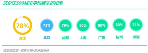 聚焦沃爾沃S90的各地折扣率,北京折扣力度最大,達(dá)73%,其余城市折扣率居于79%-81%之間,浮動(dòng)較小。