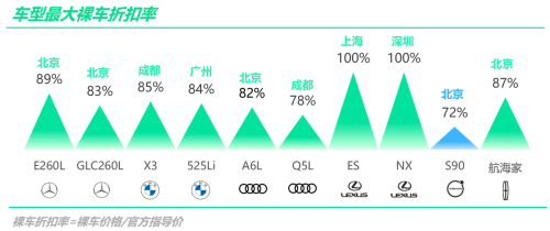 縱觀6大品牌的10款主銷車型,沃爾沃S90、奧迪A6L、奔馳GLC260L、奔馳E260L及林肯航海家5款車型在北京的折扣力度最好;奧迪Q5L及寶馬X3在成都折扣率最大;寶馬525Li在廣州折扣率最大。