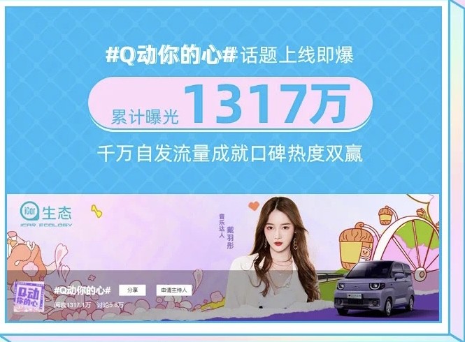 除了直播外,奇瑞新能源還發(fā)布了品牌主題曲《Q動你的心》,以快樂為共鳴源泉,與用戶同頻共振,微博話題#Q動你的心 取得1317萬的曝光量,全網(wǎng)最終收獲5.1億+次曝光。