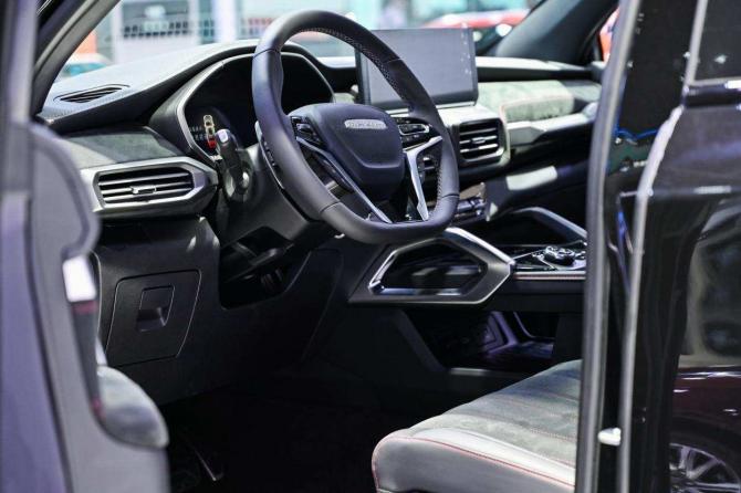 走進(jìn)車內(nèi),首先看到經(jīng)過立體切割處理的八邊形出風(fēng)口和拉絲槍灰面板,考慮到越野場景下乘客的需要,“領(lǐng)地”還貼心地配備了科技美學(xué)拉手。此外,“領(lǐng)地”是國內(nèi)首臺(tái)采用懷擋加撥片設(shè)計(jì)的越野SUV,此舉可以有效釋放副儀表臺(tái)模塊化儲(chǔ)物空間。