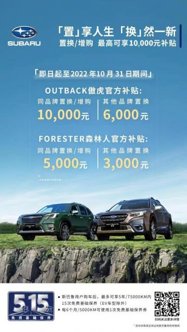 斯巴魯傲虎置換/增購官方補(bǔ)貼活動一直持續(xù)到2022年10月31日,同品牌置換/增購可享10000元補(bǔ)貼,其他品牌置換可享6000元補(bǔ)貼。有意向購買斯巴魯傲虎的用戶,快快行動起來了,機(jī)不可失時不再來!