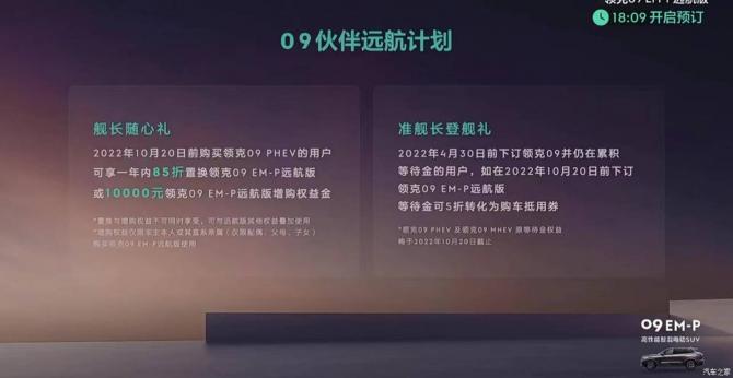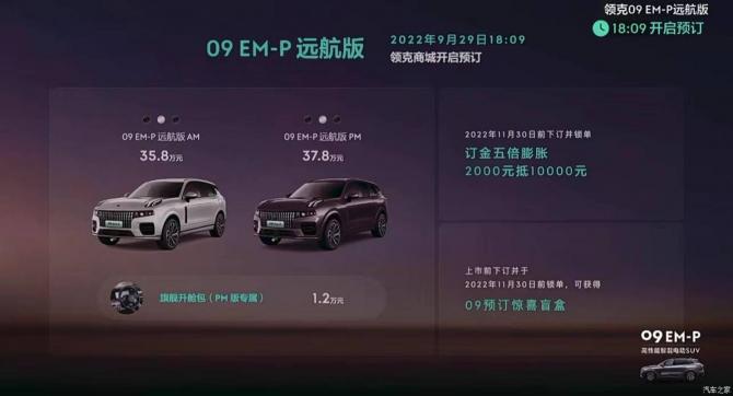 9月29日,領(lǐng)克09 EM-P遠(yuǎn)航版首次亮相,同時(shí)官方宣布其于18:09正式在領(lǐng)克商城開(kāi)啟預(yù)訂,AM和PM車型的預(yù)售價(jià)格分別為35.8萬(wàn)元和37.8萬(wàn)元,其中PM版本還可選1.2萬(wàn)元的裝旗艦升級(jí)包。2022年11月30日前下訂鎖單的用戶可享受訂金五倍膨脹,2000元抵10000元的優(yōu)惠政策,以及09預(yù)訂驚喜盲盒。11月初領(lǐng)克秋冬發(fā)布會(huì)暨6周年品牌盛典期間,領(lǐng)克09 EM-P遠(yuǎn)航版將正式上市并開(kāi)啟交付。