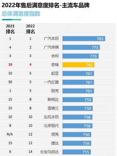 日前,全球著名調(diào)研公司J.D. Power公布了2022年中國汽車行業(yè)售后服務(wù)滿意度調(diào)查報告,奇瑞汽車以762分的成績排名第四,彰顯出奇瑞作為中國自主汽車品牌代表的扎實服務(wù)水平和強(qiáng)勁成長能力。
