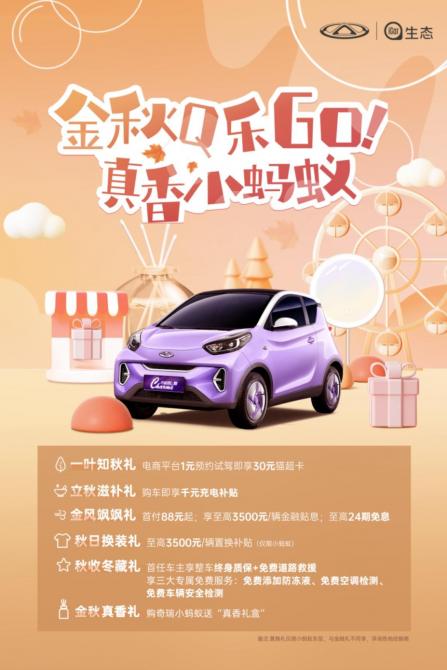 據(jù)悉十一期間購買QQ冰淇淋及奇瑞小螞蟻,電商平臺1元預約試駕即享30元貓超卡;購車即享千元電費補貼,另送“真香禮盒”、大閘蟹等;首付88元起并享至高3500元/輛金融貼息;最后還享有價值7000元安心購車禮遇,首任車主享整車/三電終身質保+免費道路救援,配備三大專屬免費服務。