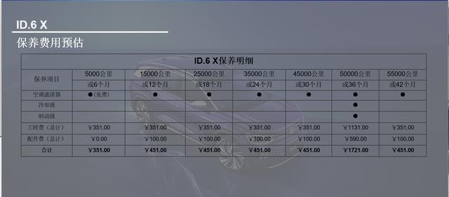 說完了用電費用和保險費用,那接下來就是保養(yǎng)費用了,對于大部分消費者來說,質保期內(nèi)肯定是在4S店來保養(yǎng)的,過了質保期有些朋友會選擇在其他第三方機構來保養(yǎng),作為一臺純電動車型,保養(yǎng)相比于燃油車又有優(yōu)勢了,根據(jù)ID.6X的保養(yǎng)手冊,車輛首保為五千公里,首保時候更換空調(diào)濾芯免費,檢查三電系統(tǒng)只需要付一下工時費就可,另外以后每一萬公里進行一次保養(yǎng)。ID.6X常規(guī)保養(yǎng)非常簡單,需要更換的也只是空調(diào)濾芯了(每一萬公里更換),兩年或者5萬公里時更換剎車油和冷卻液,此外就是工時費了。綜合來看,三年60000公里總的保養(yǎng)費用為4327元,每年的保養(yǎng)花費是1442元,還是很省的。