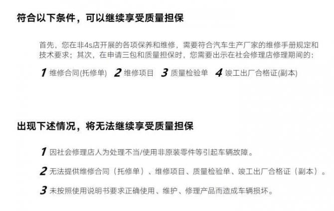 根據(jù)2022年1月1日起施行的最新版《家用汽車產(chǎn)品修理更換退貨責(zé)任規(guī)定》(新三包法),消費(fèi)者可以自由選擇心水的保養(yǎng)維護(hù)供應(yīng)商。只要快修店資質(zhì)到位,新車質(zhì)保依然受到保護(hù)。