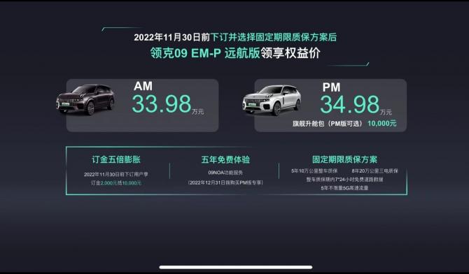 2022年11月30日前下訂并選擇固定期限質保方案后,領克09 EM-P遠航版AM領享權益價為33.98萬元,領克09 EM-P遠航版PM領享權益價為34.98萬元。