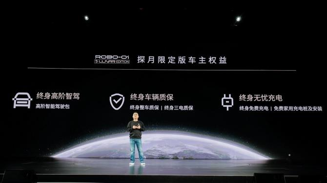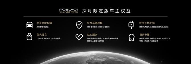 ROBO-01探月限定版售價39.98萬元,并擁有豐富的、終身相隨的專屬權益,是汽車行業(yè)少有的滿格特權。